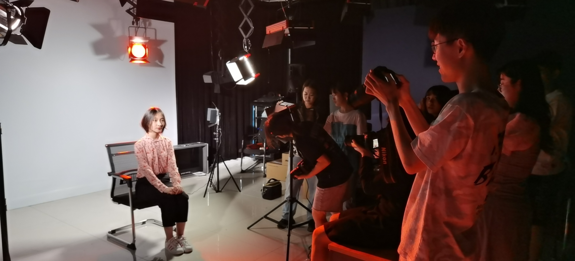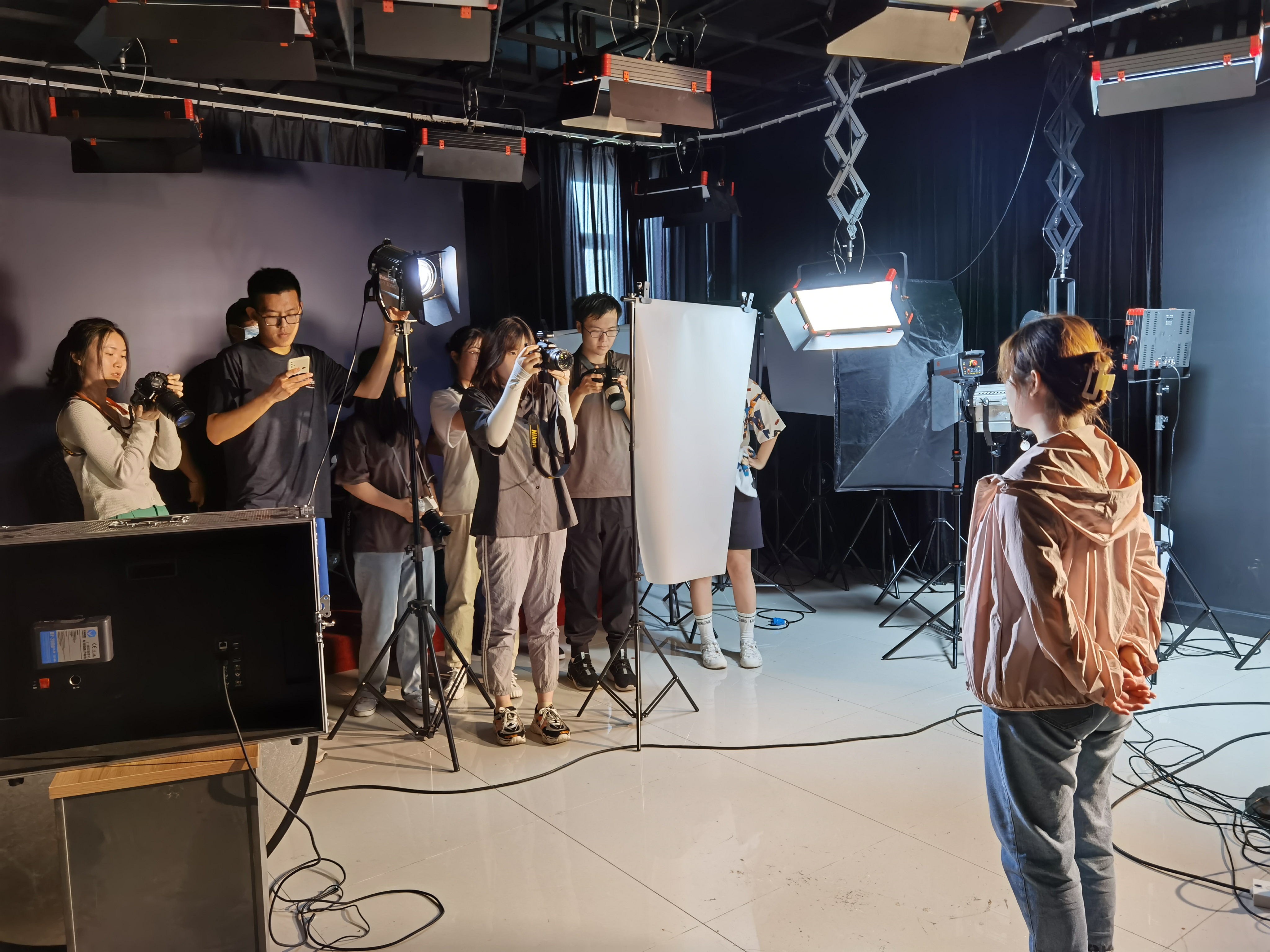 实验教学中心新闻采写实验室建成于2021年,位于东学楼北1008,占地面积为60平方米,配备有各类灯具、电动背景轴、音响以及监视设备。新闻采写实验室主要用于模拟或构建基本的拍摄环境与灯光环境,为学生提供一个可实体置景与灯光支持的拍摄环境,学习掌握室内摄像与灯光知识,同时也可作为创意创作环境提供支持。新闻采访写作综合实验室主要承担《数字影像技术》《数字音频视频技术》等课程的教学工作。